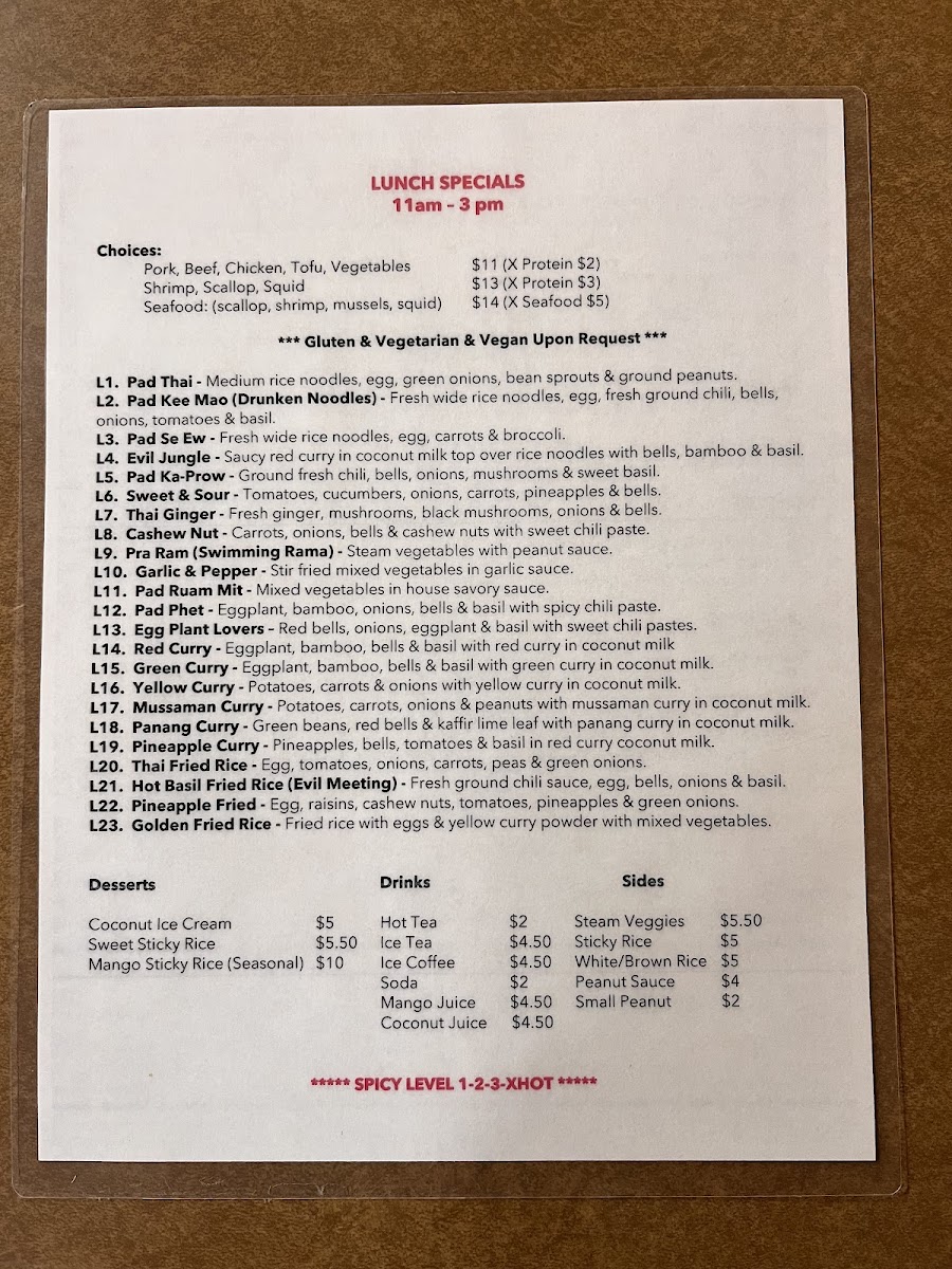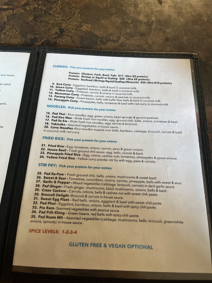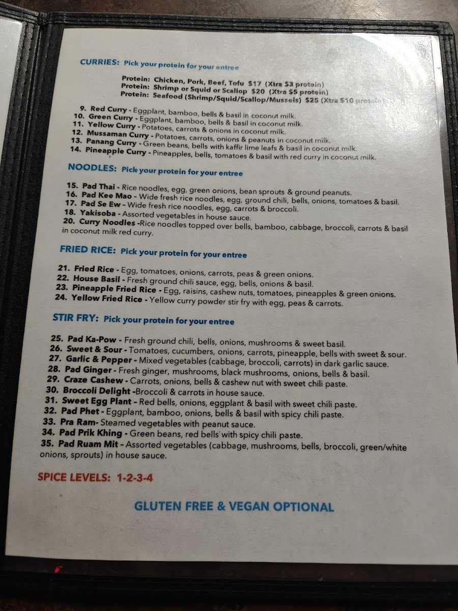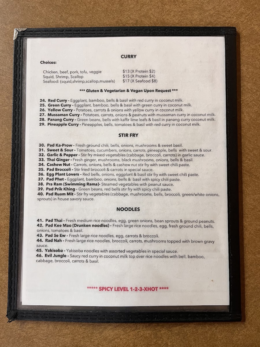 For the main course, the fried rice options are a must-try, especially the Pineapple Fried Rice and Hot Basil Fried Rice, which offer a satisfying combination of savory and aromatic flavors. Moving on to the curry section, Red Curry and Green Curry bring bold, rich flavors with a comforting creaminess that will please any spice lover. Additionally, the stir-fry dishes such as Pad Prik Khing and Thai Ginger stand out with their aromatic, flavorful profiles, offering a delightful variety of textures and tastes.