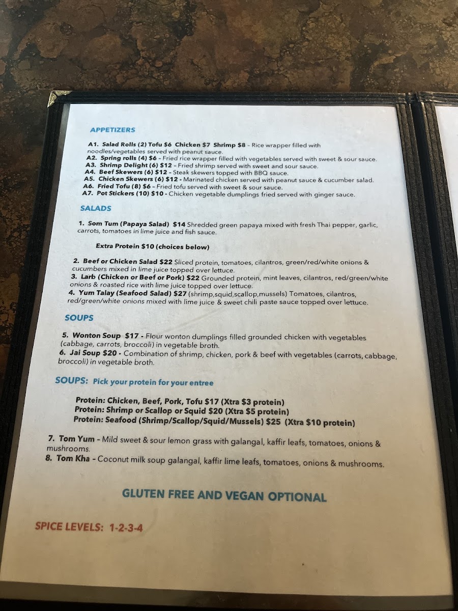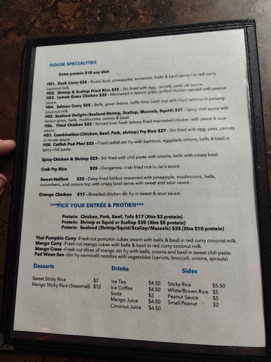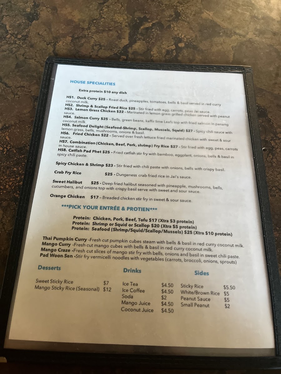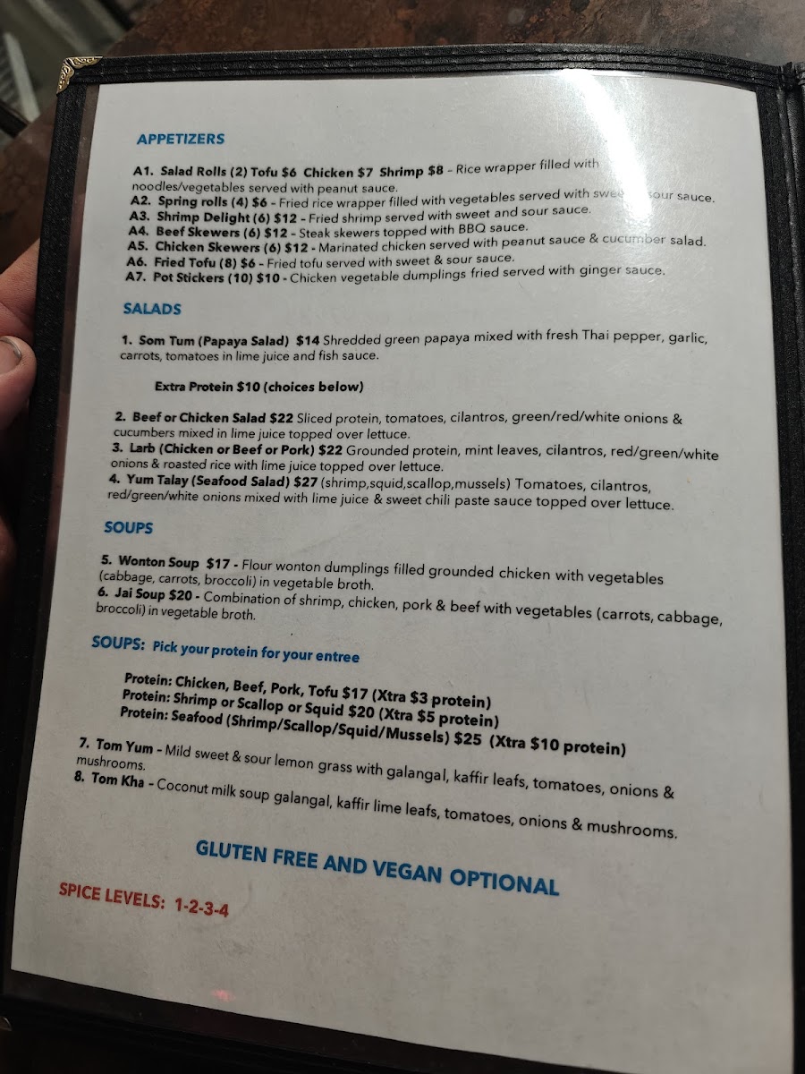 For the main course, the fried rice options are a must-try, especially the Pineapple Fried Rice and Hot Basil Fried Rice, which offer a satisfying combination of savory and aromatic flavors. Moving on to the curry section, Red Curry and Green Curry bring bold, rich flavors with a comforting creaminess that will please any spice lover. Additionally, the stir-fry dishes such as Pad Prik Khing and Thai Ginger stand out with their aromatic, flavorful profiles, offering a delightful variety of textures and tastes.